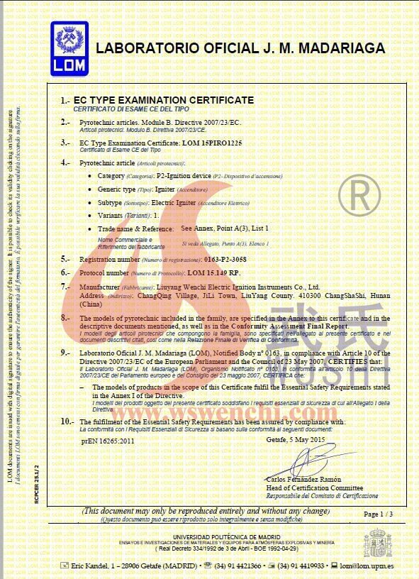 瀏陽市文馳電點火具有限公司(原培文電子點火器材廠),創建于1998年,是一家專業從事研制銷售電子點火產品的民營科技企業,是我國第1枚煙花用電點火頭生產者,是《煙花爆竹電點火頭國標》牽頭起草單位。公司位于中國“煙花之鄉”湖南省瀏陽市,地理位置優越,交通便利。 我公司研制的對象是用電能引燃火藥、做機械功等預定功能的一次性使用的元件或裝置,包括電點火頭(英文名ElectricMatch or Electric Igniter,中文俗稱“電火柴”或“電發火頭”)、電點火管和延期電點火管;我們估且在以后的產品技術欄中將我們研究的產品統稱為電點火具,將電點火器看成是用于提供和控制供給電點火元件點火的電能器材;我們研究的電點火橋路有橋絲式、無橋絲···